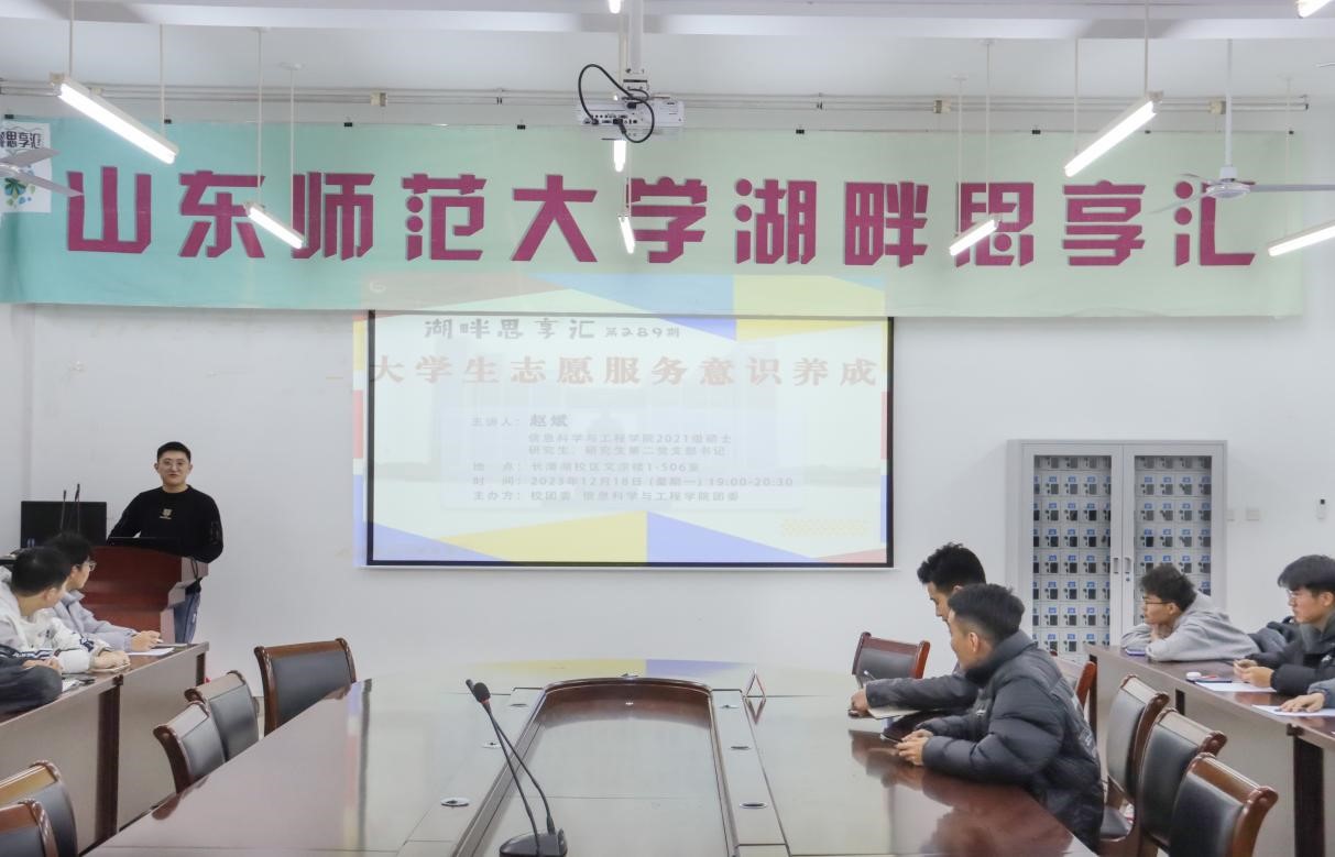 12月18日晚,信息科学与工程学院于长清湖校区文淙楼1-506会议室成功举办湖畔思享汇之大学生志愿服务意识养成主题讲座。本次讲座由山东师范大学团委与信息科学与工程学院团委联合举办,学院2021级硕士研究生、研究生第二党支部书记赵斌主讲,2023级本科生辅导员张亮主持,2023级各班班委到场聆听。