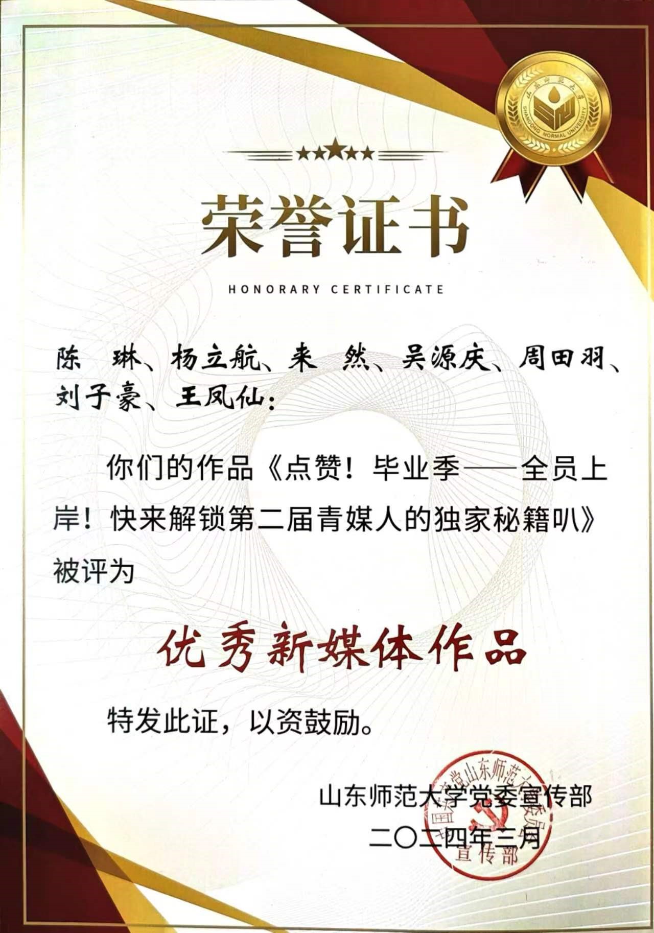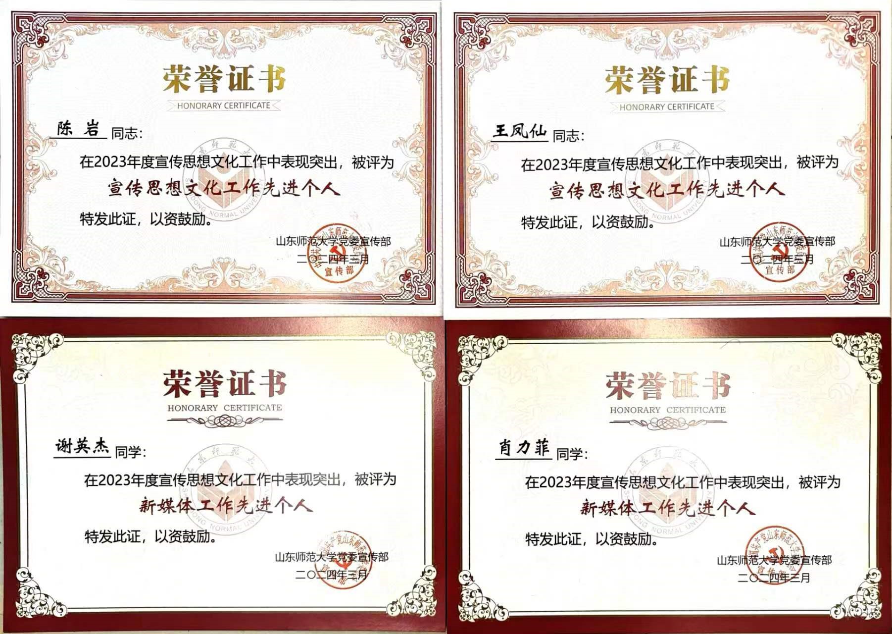 4月11日上午,山东师范大学2024年度宣传思想文化工作会议在长清湖校区树惠堂召开。信息科学与工程学院荣获学校2023年度优秀网站奖,陈岩、王凤仙获宣传思想文化先进个人奖,本科生谢英杰、肖力菲获新媒体工作先进个人奖,作品《点赞!毕业季——全院上岸!快来解锁第二届青媒人的独家秘籍叭》被评为优秀新媒体作品。