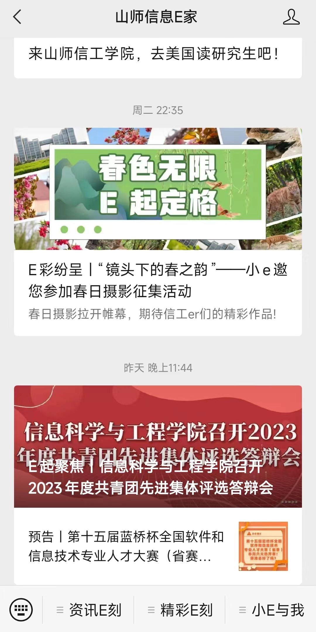 2023年学院微信公众平台“山师信息E家”共发表原创推送243篇,较前一年增长20%,微信公众号关注量达到8068人,阅读总量达26万余次,单篇阅读量达1.2万次,宣传效果再创新高。新增设“E帆讲坛”“E彩纷呈”等系列专栏,将学院学术讲座、文体赛事情况、学院大事记等新闻资讯呈现给全体师生,全面展示了学院的精彩事迹。