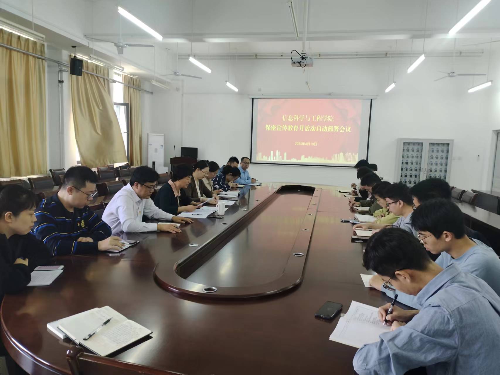 为深入贯彻落实习近平总书记关于保密工作的重要讲话和重要指示批示精神,做好新修订的《中华人民共和保守国家秘密法》宣传贯彻工作,切实增强学院师生国家安全保密意识,维护国家安全和利益,根据学校有关工作部署要求,信工学院于4月18日上午在文淙楼506会议室组织开展保密宣传教育月活动启动部署会。