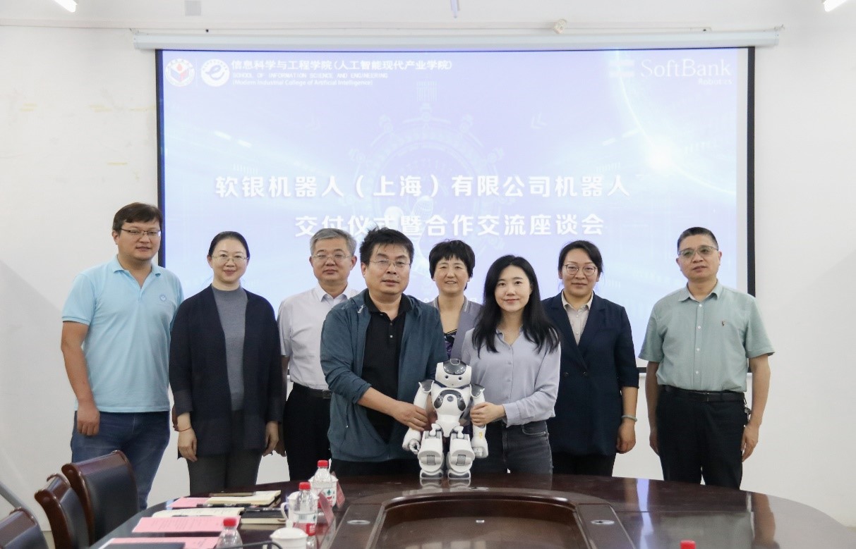 5月9日下午,信息科学与工程学院与软银机器人(上海)有限公司机器人交付仪式暨合作交流座谈会在长清湖校区文淙楼1-506会议室举行。软银机器人(上海)有限公司总经理邱靓,市场部负责人何奕凡,学校教务处副处长崔文新,学院党委书记钟秀芳、副书记刘一颍、副院长孙建德、人工智能系主任鲁燃、计算机系副主任贾伟宽和部分教师代表出席本次仪式。