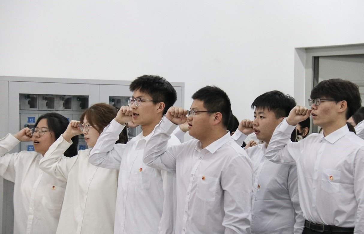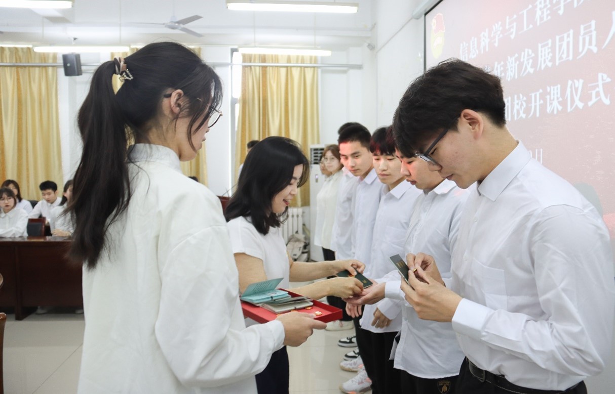 仪式伊始,全体人员奏唱国歌。随后,主持人罗森宣读新发展团员名单,宣布张竣杰等17人加入共青团。王凤仙、张亮为新发展团员颁发团徽徽章及团员证,优秀团员代表冯小一带领新发展团员诵读誓词。