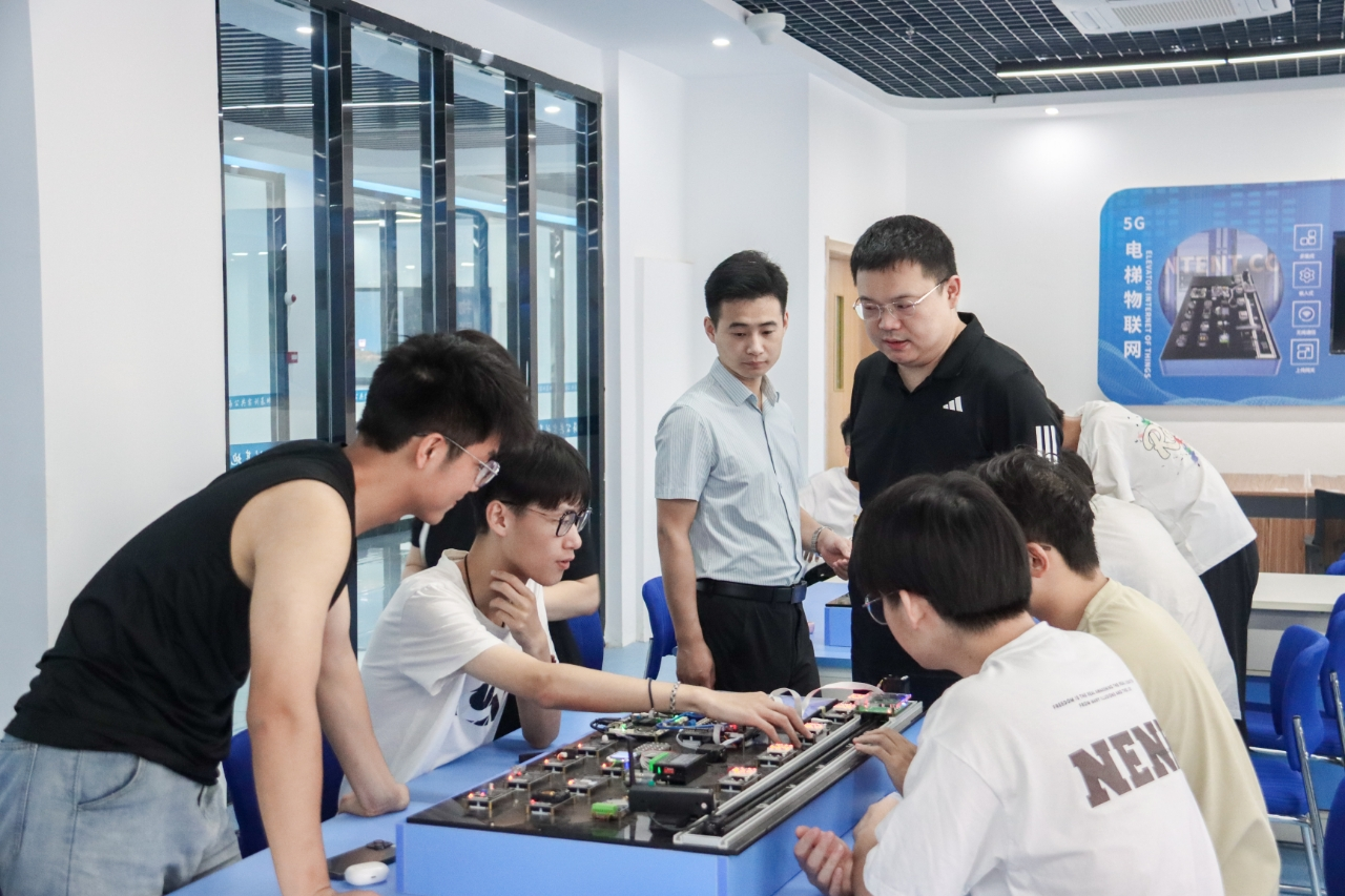 7月12日上午,在实训基地工作人员带领下,我院师生分别参观了5G电梯物联网实训台、物联网通信技术实训台、电子沙盘等。在指导教师的引导下,同学们在1+X物联网通信技术实训台和5G+AI0T实训台上进行了实操,表现出极大的学习热情和积极性。