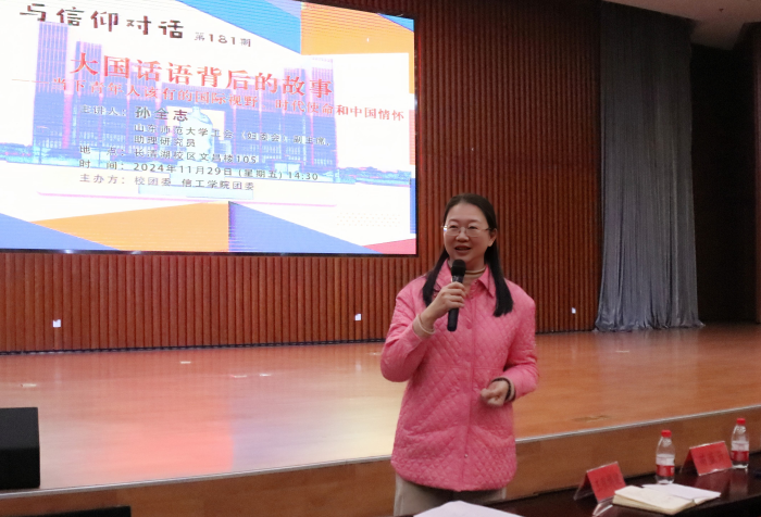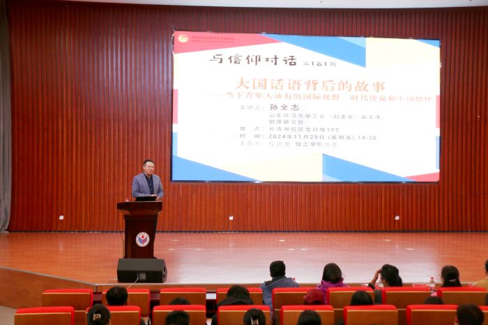 11月29日下午,由校团委、信息科学与工程学院团委联合举办的第181期“与信仰对话:大国话语背后的故事”在文昌楼105报告厅举办。活动邀请山东师范大学工会(妇委会)副主席孙全志担任主讲。信息科学与工程学院党委副书记刘一颍、学院全体辅导员,我院和兄弟学院党支部党员和入党积极分子参加活动。活动由刘一颍主持。
