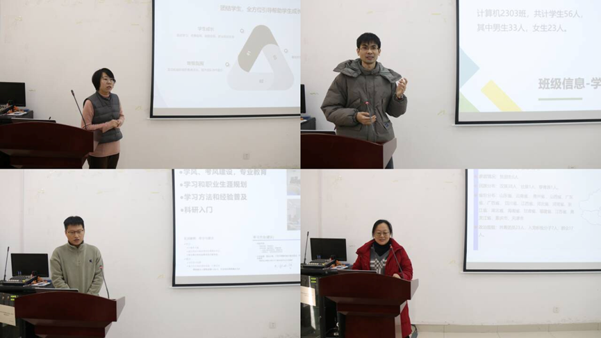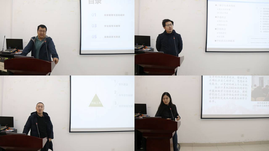 工作总结汇报中,郭林林等8名2023 级班主任围绕班级情况、学生学业情况、班级活动创新等工作进行汇报。工作交流座谈环节,贾伟宽、刘一颍与2023级、2024级班主任聚焦专业学习、职业规划、校园生活等主题,就如何进一步提升班主任工作质量和水平进行了充分的讨论,为2024级班主任工作开展提供了有益参考和建议。