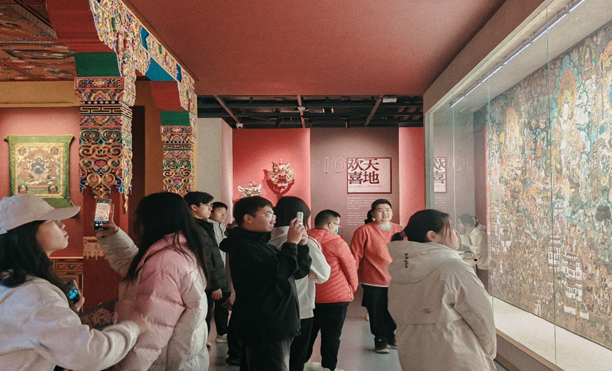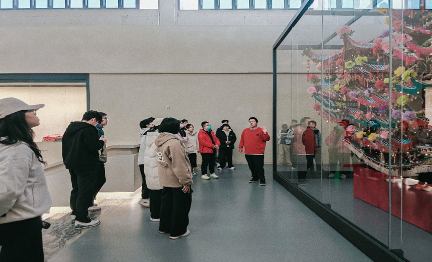 在参观过程中,同学们跟随讲解员的解说依次参观了 “文明起源与工艺传承”“地域文化与民间艺术”“设计创新与时代使命” 等十个单元的展品,直观感受到传统工艺的匠心精神。同学们时而驻足细观非遗工艺品的精湛技艺,时而围绕融合人工智能技术的设计作品展开热烈讨论,在跨学科的视角碰撞中感受 “科技为艺术赋能,艺术为科技铸魂” 的深层内涵。结合历史背景、文化寓意与设计理念,为同学们勾勒出 “艺术源于生活、高于生活” 的立体图景,让同学们在传统工艺与现代设计的交织中感受艺术魅力。