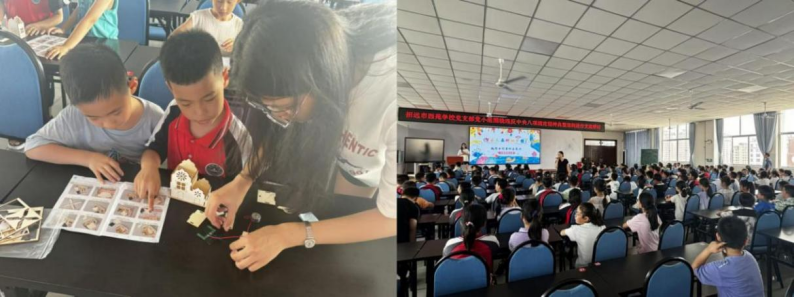 在招远市西苑小学,实践队员面向二年级全体学生设计了一系列科技与童真结合的课程,孩子们热情高涨,争相参与互动问答。尤其是实践队精心设计的太阳能小屋科普手工制作、创意绘画和山东省科普能力提升工程视频,深受现场学生的喜爱,有效激发了孩子们对科技的兴趣。