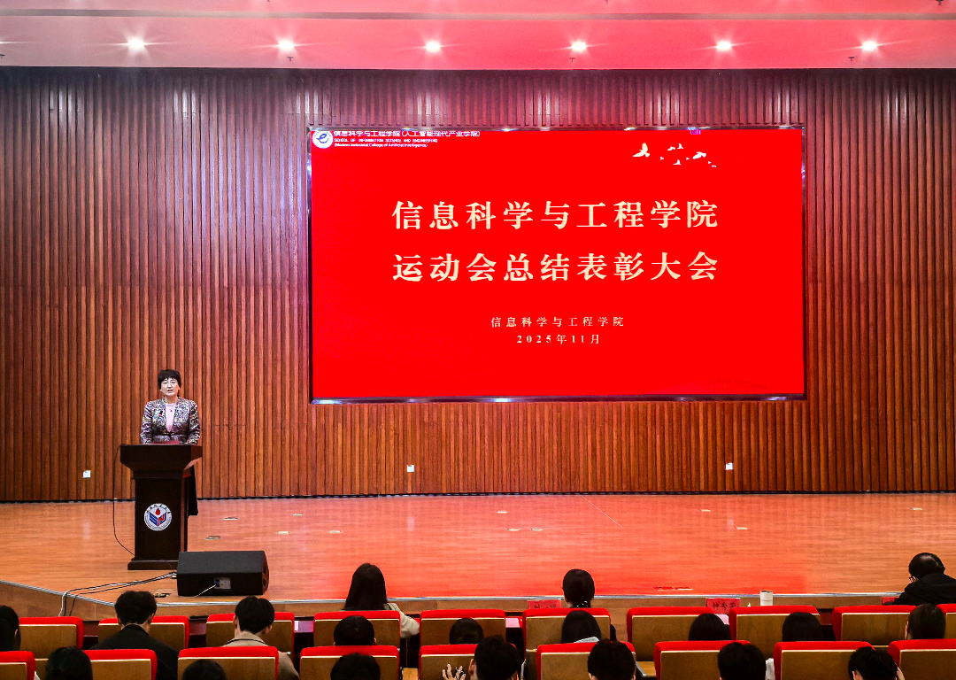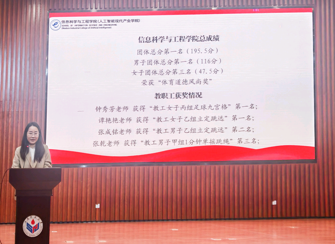 2025级研究生辅导员周惠芬宣读了信息科学与工程学院关于十佳运动员、优秀运动员、特殊贡献奖和优秀团队的表彰名单。