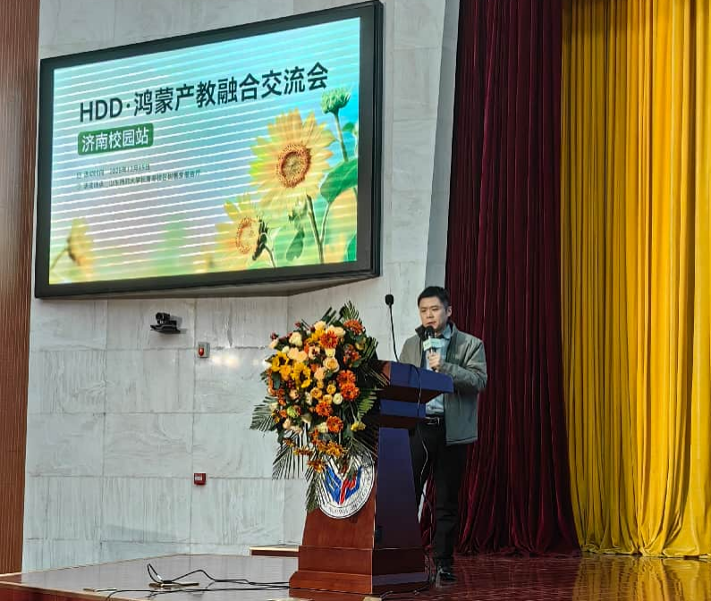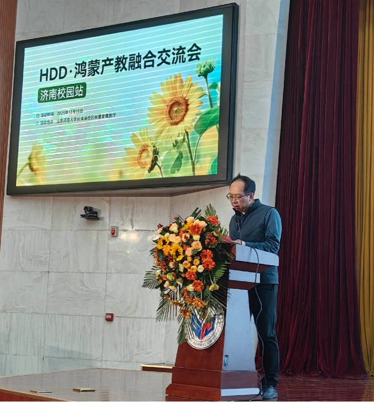 12月15日,“HDD·鸿蒙产教融合交流会济南校园站”活动在山东师范大学长清湖校区树蕙堂报告厅举办。活动由华为开发者联盟主办、山东师范大学计算机与人工智能学院承办、博赛数字科技集团协办。校党委常委、副校长蔡阳健,华为鸿蒙生态布道师陈重阳,博赛集团董事长董良,学院党委书记钟秀芳,副院长孙建德,山东管理学院、山东交通学院、山东女子学院等兄弟院校及计算机与人工智能学院师生代表齐聚一堂,共话鸿蒙生态建设与人才协同培养之道,为数字中国建设注入新动能。