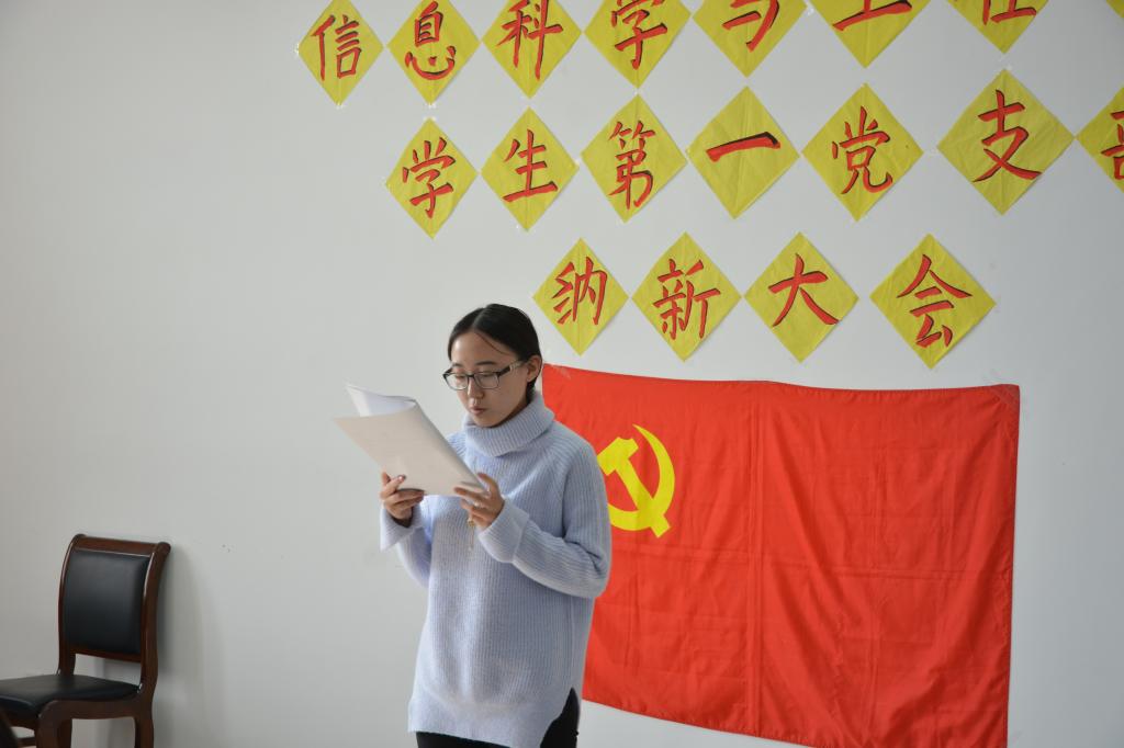 大会在庄严的《国际歌》歌声中拉开帷幕,会议严格按照发展程序进行,杜明文等18名党员发展对象依次宣读《入党志愿书》,汇报自己在培养期间对党的认识和思想发展过程、入党动机、现实表现情况以及需要向党组织说明的问题,表明了入党态度和加入党组织的决心。随后,刘卓、李涛等入党介绍人向支部大会介绍发展对象的基本情况、政治思想状况、现实表现及对其培养、教育和考察过程等,深入剖析了每位同志的优点及现存的不足,并对其能否入党表明了自己的意见。与会党员对18名党员发展对象进行充分讨论并采取无记名投票方式进行表决。接着,支部宣传委员孙德猛代表支委会宣布支部大会决议,根据表决结果,全体党员一致同意杜明文等18名同志成为中共预备党员。18名同志纷纷表示,一定以优秀党员的标准严格要求自己,严于律己,不断加强自身党性修养,牢记宗旨义务,立足实际做贡献,发挥党员的先锋带头作用,不辜负党组织对自己的培养。最后,纪新智对新加入组织的18名预备党员表示热烈祝贺,并指出作为学生党支部的一员,要高度认识加入党组织的意义和光荣性,加入党组织是每一个进步青年的追求和希望,是个人政治生命新的开始;要牢记自己的党员身份,增强“先锋模范”的意识,在以后的生活中,更加严格的要求自己,争做优秀学生,争做文明标兵,争做遵守校规校纪的楷模。