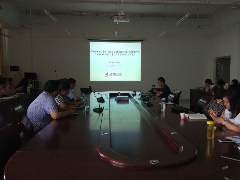 5月31日,应山东师范大学信息科学与工程学院邀请,美国卡内基梅隆大学博士后常晓军在长清湖校区学院楼506会议室做了题目为《Complex Event Detection using Semantic Saliency and Nearly-IsotonicSVM》的学术报告。学院老师孙建德教授主持了本次会议,学院院长张化祥教授、部分老师、博士、硕士研究生聆听了此次报告。