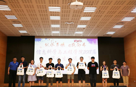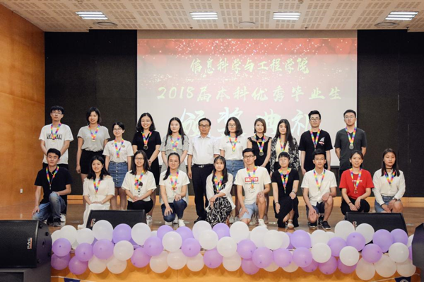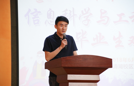 “我们曾在天地书声询问何为浩瀚,在明心湖畔感受白云苍狗。”一段开场视频将18届毕业生带回四年前的美好时光。视频中一张张青涩的笑脸变成如今成熟的模样,聆听着老师们的谆谆教诲和殷殷祝福,在场的许多毕业生不禁热泪盈眶。张化祥院长寄语毕业生们:前路漫长,我们要对未来充满希望,以感恩之心面对生活,勇于担当,诚实守信,坚守本心。在未来的工作生活中,要立足实际,不断创新,不懈奋斗,努力开创美好未来。随后,张维军书记宣读了《关于表彰信息科学与工程学院2018届优秀毕业生的决定》,并为罗学鹏、范媚琳、丁晓倩等“优秀毕业生”、“学术之星”、“体育之星”进行颁奖。在同学们的热烈欢迎中,计算机系主任王红教授代表全体教师为毕业生们送上祝福,鼓励大家要内心强大,相信自己,活在当下,充满敬畏。毕业生代表罗学鹏在发言中表达了对母校多年培养的感谢和对在信工四年时间里的怀念和不舍。他表示,展望未来,信工学子将秉承高尚品德,弘扬崇高理想,以梦为马,博学笃行,砥砺前行。
