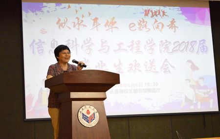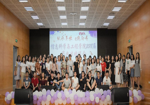 6月6日晚,信息科学与工程学院于长清湖校区图书馆报告厅举行“似水年华·E路向前”2018届毕业生欢送会。学院党委书记张维军,院长张化祥,党委副书记孙芙蓉,新疆内派管理服务老师古丽拜克热•买买提,计算机系主任王红,通信系主任杨峰,团委书记纪新智,辅导员石晓雪、刘卓、李涛,办公室老师韩海琦与全体毕业生齐聚一堂,共同为即将开启新征程的毕业生们送行。