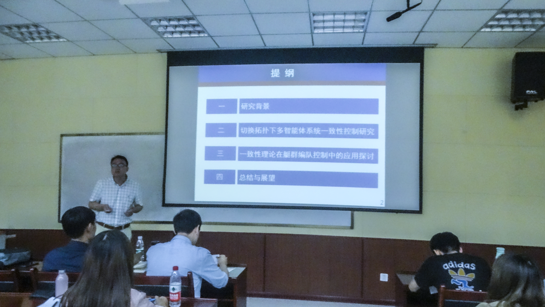 报告会中,温广辉教授介绍了处理切换拓扑下一致性控制问题的关键技术:单个Lyapunov函数法和多Lyapunov函数法。针对有向切换拓扑下的线性多智能体系统,通过构造多Lyapunov函数,给出了基于驻留时间的多智能体系统一致性判据,并进一步探讨了一致性理论在无人艇编队控制中的应用,最后对目前热点研究领域进行了总结。