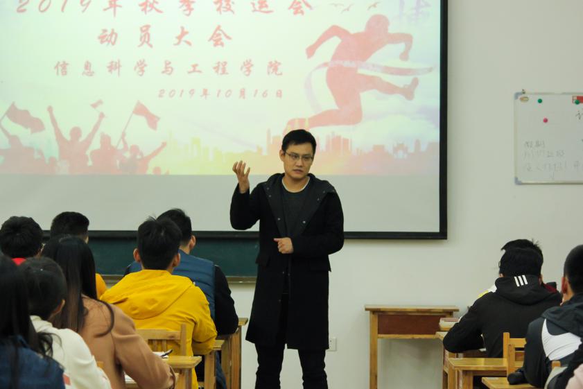 10月16日中午,信息科学与工程学院于长清湖校区文宗楼106教室举办了2019年秋季运动会动员大会。信息科学与工程学院辅导员李涛老师、王凤仙老师、本届运动会所有参赛运动员、教练员及学生会工作人员参加此次活动。