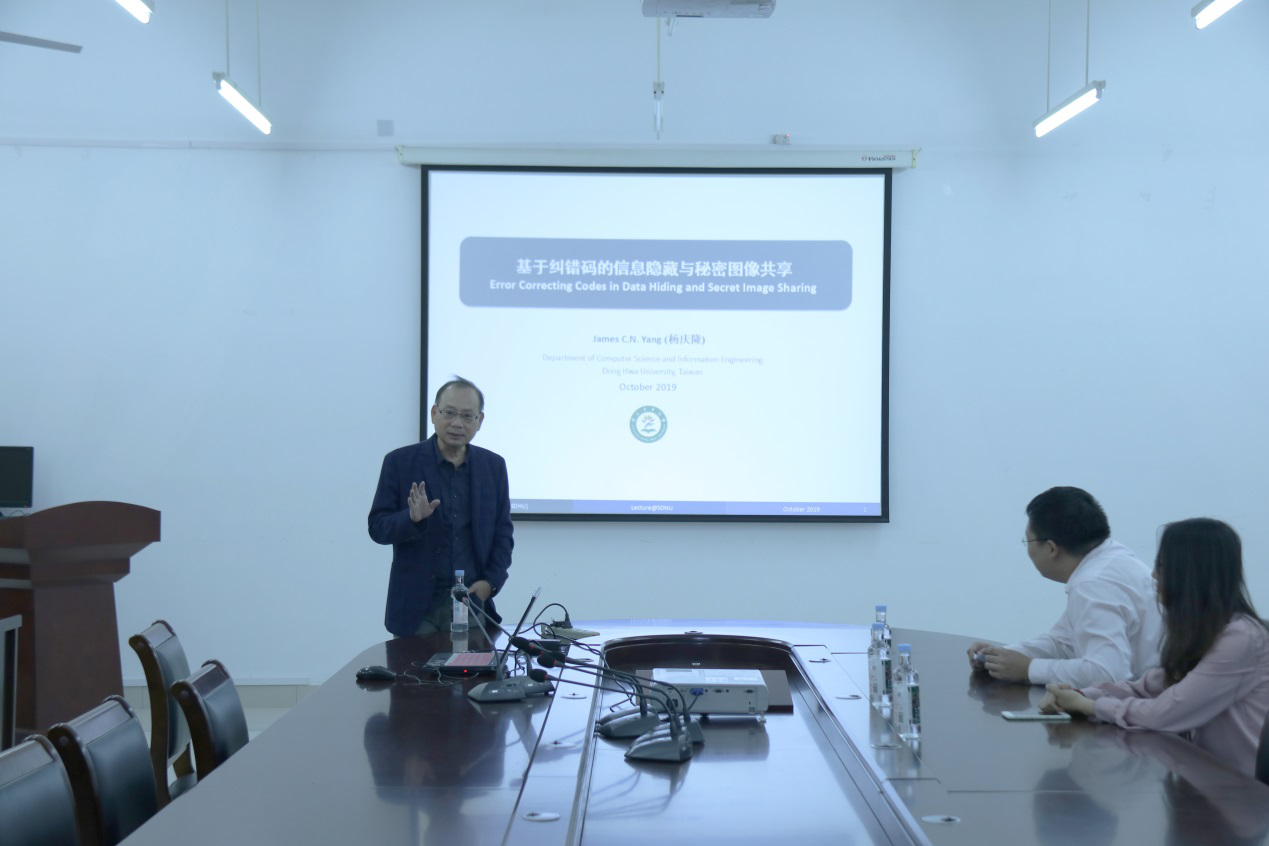 10月24日,应山东师范大学信息科学与工程学院邀请,台湾东华大学杨庆隆教授于长清湖校区文宗楼506会议室做了题为“基于纠错码的信息隐藏与秘密图像共享”的学术报告。报告会由信息科学与工程学院万文博老师主持,学院部分教师、硕博士研究生聆听了此次报告,并参与讨论。