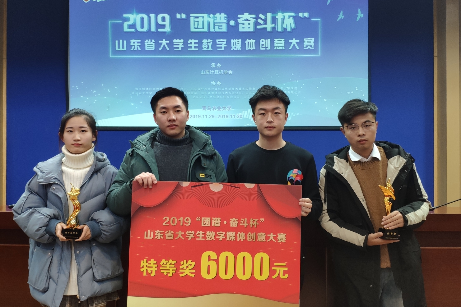 11月30日,第十一届山东省大学生科技节——“团谱·奋斗杯”山东省大学生数字媒体创意大赛成功举办,由信息科学与工程学院李焱老师指导的2017级学生王新杰、张雯欣、孙威振和王赫团队荣获特等奖荣誉。