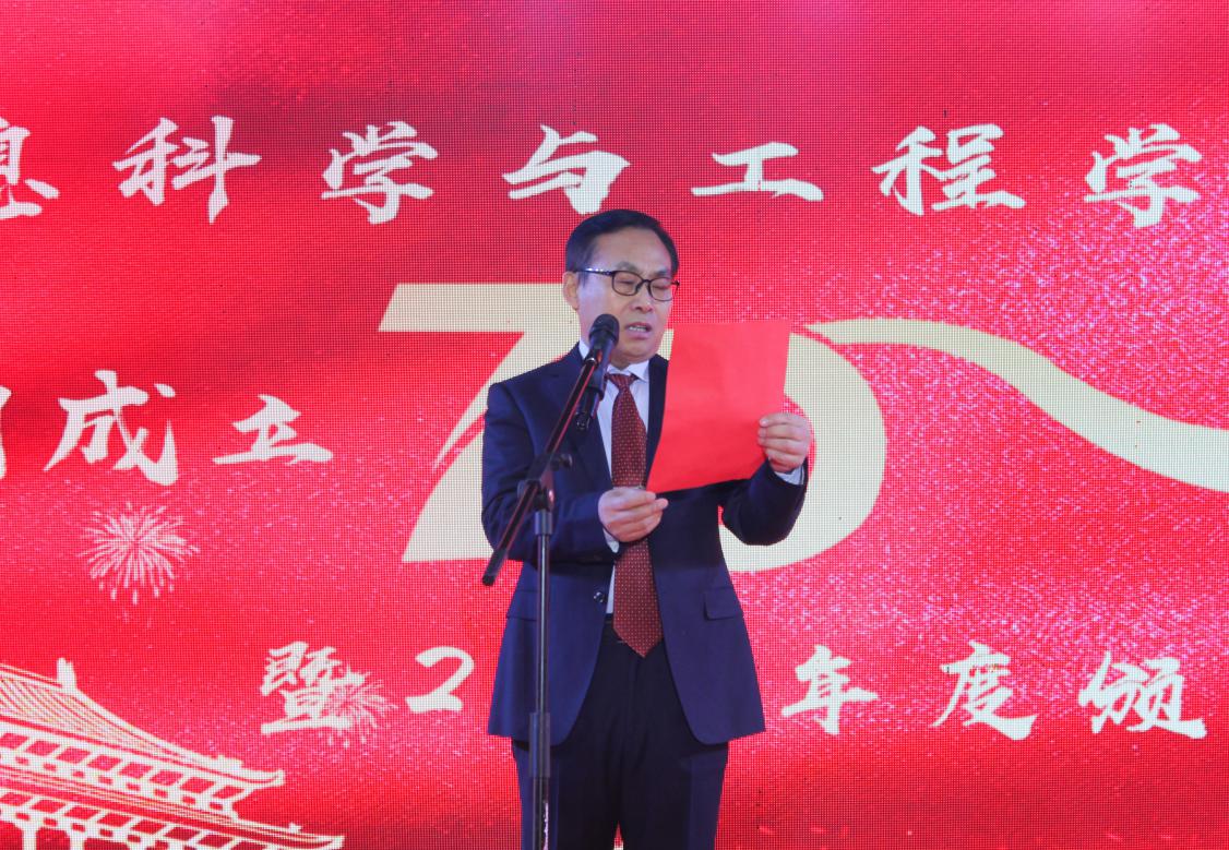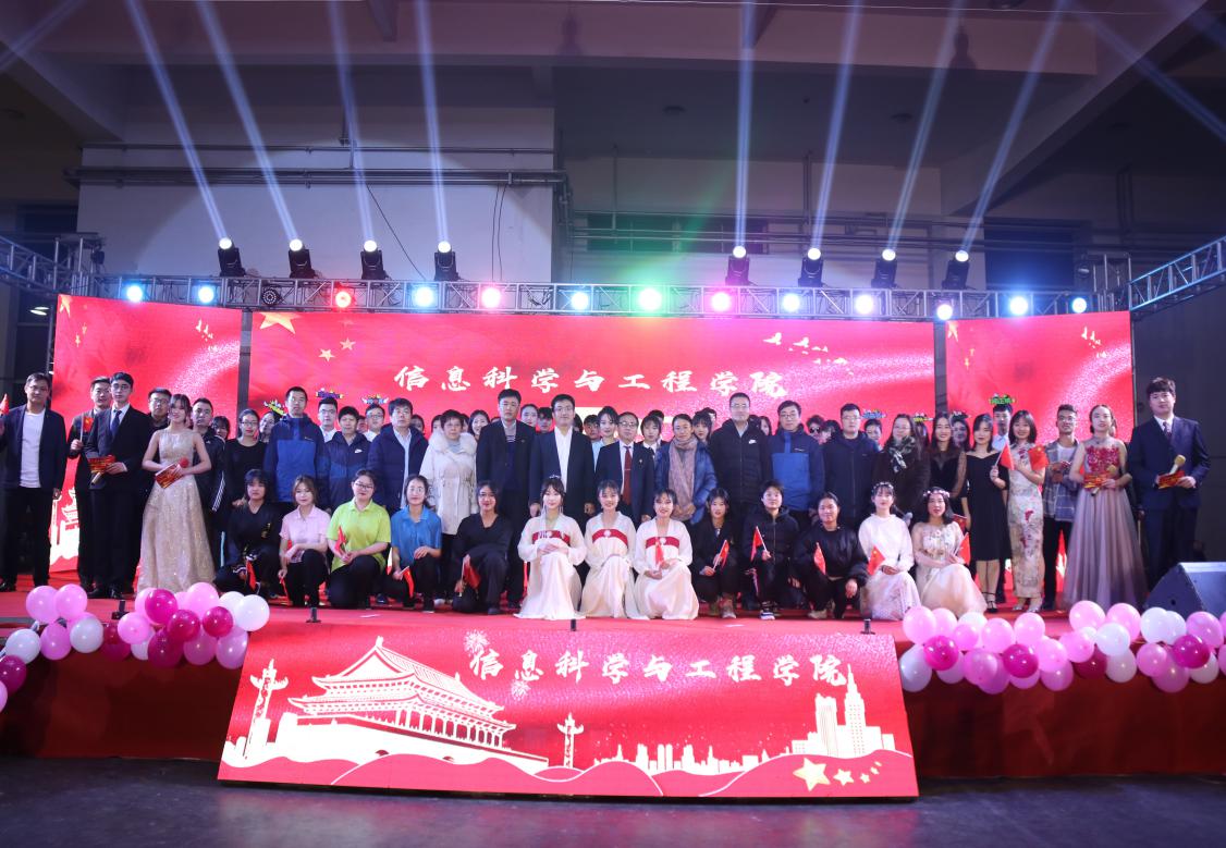 壮丽七十载,筑梦新未来。12月22日晚,由信息科学与工程学院团委主办、院学生会承办的庆祝新中国成立七十周年暨2019年度颁奖典礼于长清湖校区风雨体育馆隆重举行。学院党委书记张维军,党委副书记、院长郑元杰,党委副书记孙芙蓉,副院长宋信敏,各系主任,各年级辅导员,学院其他教师代表,以及2019级新生共同出席晚会。