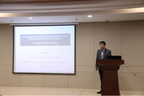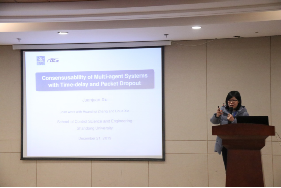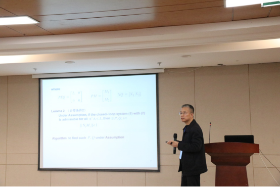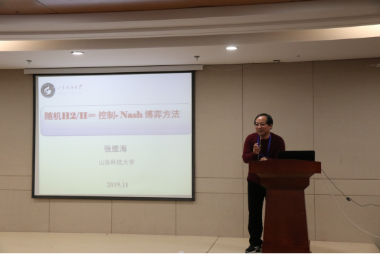 开幕式后进行了气氛热烈的学术报告交流研讨。本次研讨会共设11场学术报告。山东科技大学张维海教授、青岛大学林崇教授、山东大学张宪福教授、烟台大学吴昭景教授、青岛大学于金鹏教授、山东大学刘帅教授、山东大学冯俊娥教授、济南大学孙元功教授、山东大学徐娟娟教授、哈尔滨工业大学(威海)考永贵教授、曲阜师范大学孙宗耀教授分别作了精彩的学术报告,内容涉及复杂系统理论与人工智能研究领域各个研究方向,包括随机H_2/H_infinity控制-Nash博弈方法、广义系统鲁棒控制、非线性系统、机器人随机PWM控制、多智能体一致性及分布式优化、变维系统、切换系统等,引起了参会学者与老师们的极大兴趣,并对相关问题进行了热烈的交流与讨论。