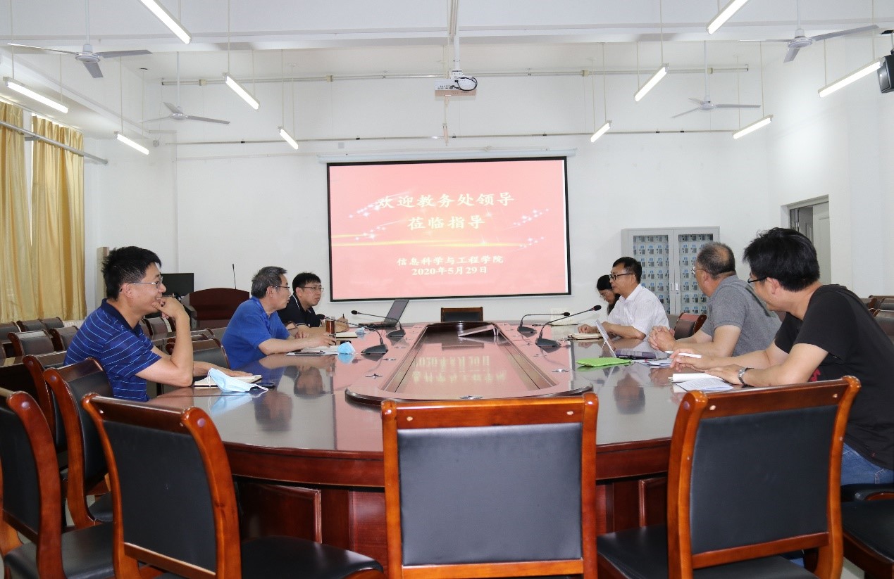 5月29日下午14:30,教务处马池珠处长、贾斐副处长和王中杰老师一行3人来我院调研指导工作。座谈会在长清校区文宗楼506会议室举行,学院张维军书记、孙芙蓉副书记、宋信敏副院长、杨峰老师和王吉华老师等参加了座谈会。