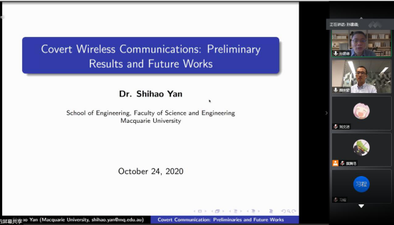 10月24日,信息科学与工程学院“70周年校庆系列学术活动”线上报告会成功举办。应学院邀请,颜世豪教授做了题为“Covert Wireless Communications:Preliminary Results and Future Works”的学术报告,本次报告由山东师范大学信息科学与工程学院副院长、博士生导师孙建德教授主持,学院部分教师、硕博士研究生聆听了此次报告,并参与讨论。