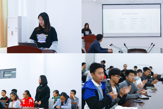 其次,王玥楠代表学院学生会志愿权益与服务部发表讲话。她首先对新生最差宿舍“量多、分低”的现象提出批评,并从“检查原因、卫生细则、标准展示、疑问解答”四个环节与新生舍长展开卫生研讨。她表示检查宿舍的根本目的是督促学生整理内务,进而保障学生良好的学习生活环境,随后根据卫生检查反馈分别从“床被整洁、物品摆放、环境卫生、用电安全”四个角度详细地讲述了检查标准,并展示图例以供参考。在最后的问答环节中,王玥楠对新生的提问做出了详尽的回答。