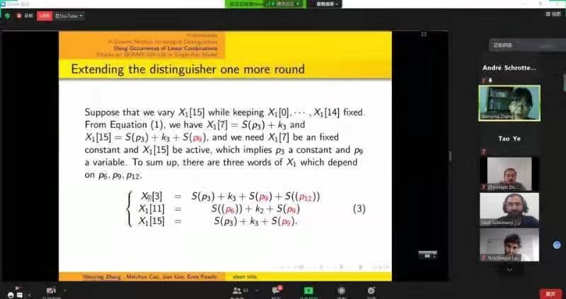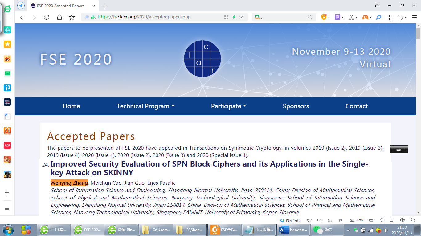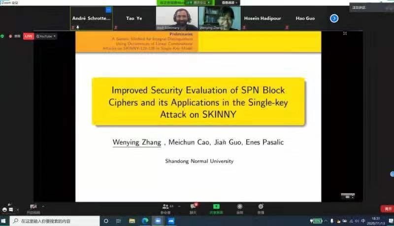近日,国际密码协会(IACR)旗舰会议之一的FSE 2020(the 27th edition of Fast Software Encryption conference)刚刚结束。会议原定2020年3月21-27日在希腊举行,由于Covid-19疫情原因,延迟到11月9日-13日网络举行。本次会议共收录了73篇论文,涵盖了2019年4月-2020年10月共计一年半时间的对称密码领域研究进展报告。并且由于疫情影响,2021年FSE取消,会议内容被平分到2020年FSE和2022年FSE。FSE是对称密码领域的顶级会议,山东师范大学信息科学与工程学院张文英教授参加了会议,并有2篇论文在该会发表。