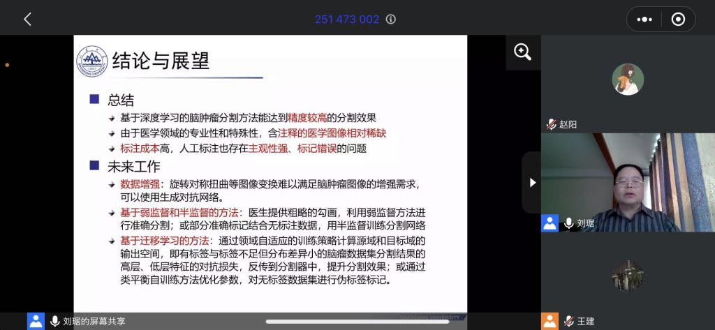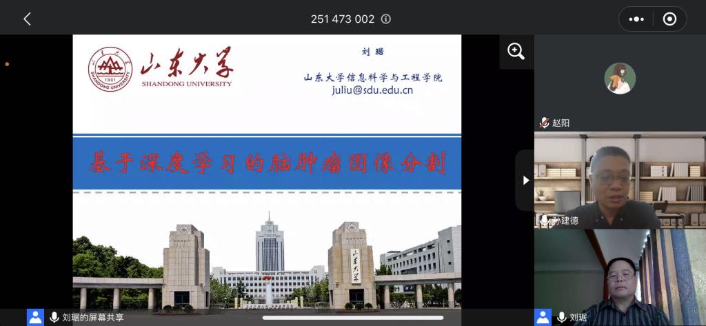 2020年10月26日,应山东师范大学信息科学与工程学院邀请,山东大学信息科学与工程学院副院长刘琚教授为我院师生作了题为“基于深度学习的脑肿瘤图像分割”的线上学术报告。报告由信息科学与工程学院副院长、博士生导师孙建德教授主持,学院部分教师、硕博研究生聆听了此次报告,并参与讨论。