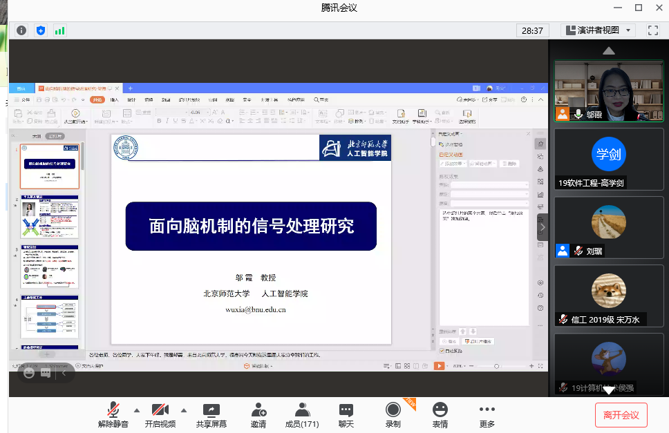 会议一开始邬霞教授简述了脑神经机制的研究有助于我们认识脑、保护脑、开发脑甚至创造脑,引起了在场老师以及学生的兴趣;其次邬霞教授提到了构建面向大脑特征提取的信号处理方法,可进一步透彻明了脑神经机制,主要研究工作包括经典模型验证、新型模型构建、认知行为预测以及认知行为提升;最后邬霞教授分享了对于脑神经方面所涉及的预防、诊断、治疗以及康复的部分知识,也使我院师生深受其益。