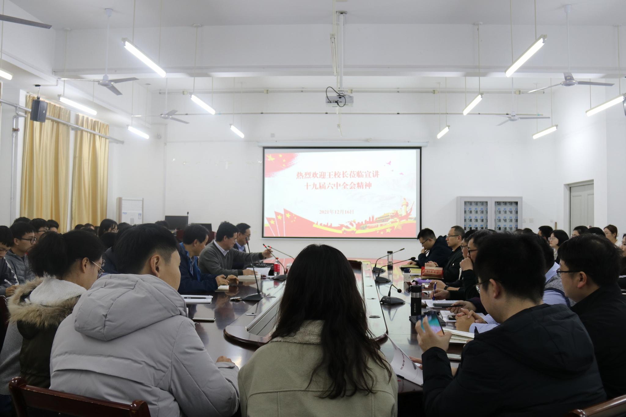 王传奎副校长首先从我党历史上形成的《关于若干历史问题的决议》和《关于建国以来党的若干历史问题的决议》产生的背景及其重要历史意义为切入点,引出党的十九届六中全会召开的重要意义和主要任务。然后他围绕习近平总书记在党的十九届六中全会上的重要讲话精神和全会精神、全会审议通过的《中共中央关于党的百年奋斗重大成就和历史经验的决议》并结合自身学习体会,从要深刻认识总结党的百年奋斗重大成就和历史经验的重大意义、要深刻认识党的百年奋斗的初心使命和重大成就、要深刻认识中国特色社会主义进入新时代的历史性成就和历史性变革、要深刻认识党的百年奋斗历史经验等四个方面,阐释了党的十九届六中全会的精神实质和丰富内涵。最后,他结合学院工作、师生个人发展,要求全体师生不仅要学习好、理解好、把握好党的十九届六中全会精神,更要与工作、学习和生活相结合,把党的十九届六中全会精神贯彻落实到实际工作中,促进学院工作快速发展。对今后如何贯彻落实党的十九届六中全会精神,王传奎副校长为学院师生提出了三点建议和要求:一是要通过学习掌握一个系统观念、系统思维,具体到工作中每个人就要有大局观,要有集体意识;二是要做好党建工作,切实发挥好党建引领作用,把党建与教学、科研、人才培养融合发展;三是要形成一个凝心聚力的氛围,凝心就是要凝聚信心、明确奋斗目标方向,聚力就是要聚集干事创业的力量,要齐心协力才能发展事业。