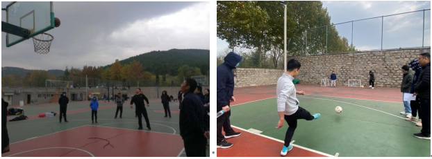 秋未尽,冬已来。深秋,万物始藏,已经有些许的寒意,却挡不住大家运动的热情。上午9时,老师们如约来到篮球场地报到、热身,进行必要的准备活动。大家三五一堆,投篮的投篮,踢球的踢球,人人脸上洋溢着自信和朝气,处处是欢声笑语。