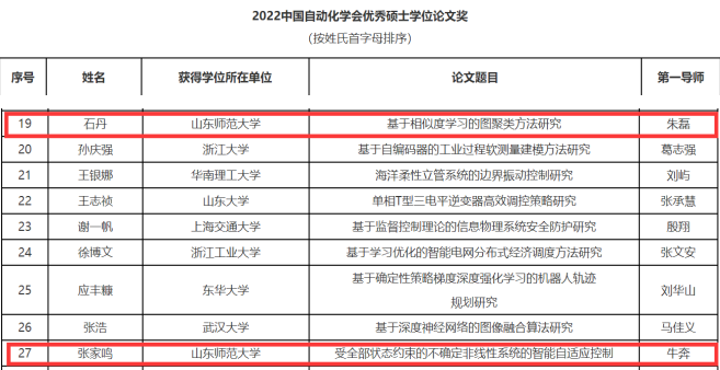 2022中国自动化学会优秀硕士学位论文奖评审工作于2023年1月16日结束。经专家评审委员会评审,最终评选出29篇2022中国自动化学会优秀硕士学位论文奖。其中我院朱磊教授指导的2017级硕士生石丹和牛奔教授指导的2019级硕士生张家鸣荣获“2022中国自动化学会优秀硕士学位论文奖”,朱磊教授和牛奔教授获“2022中国自动化学会优秀硕士论文导师奖”。