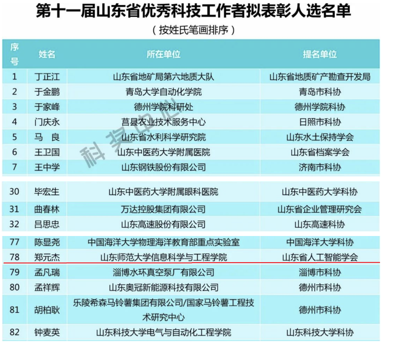 近日,山东省科学技术协会公布第十一届山东省优秀科技工作者名单,山东师范大学信息科学与工程学院郑元杰教授成功入选。