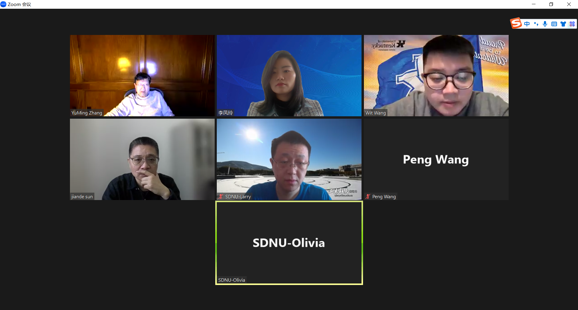 2023年3月10日上午9:00,山东师范大学信工学院与美国肯塔基大学招生组成功举行线上交流会。肯塔基大学工程学院张裕明教授、王鹏教授、招生办主任王智智老师,山东师范大学国际交流处副处长尹弢、交流科科长张鸥,信息科学与工程学院副院长孙建德、学院办公室李凤玲等出席了会议。
