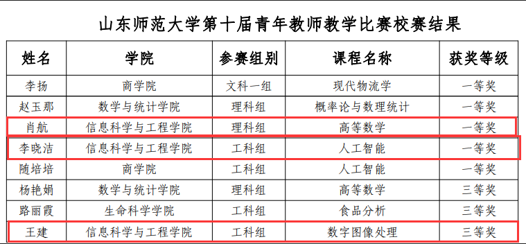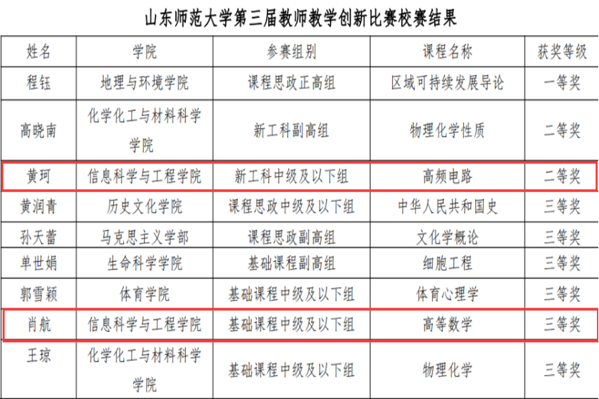 近日,山东师范大学第三届教师教学创新比赛结果已经公示,我院黄珂、肖航两位老师分获二等奖、三等奖。同时,山东师范大学第十届青年教师教学比赛结果也已公示,我院肖航、李晓洁两位老师获校级一等奖,王建老师获校级三等奖,李晓洁老师将代表学校继续参加山东省青年教师教学比赛。学校授予肖航、李晓洁两位老师“山东师范大学教学能手”荣誉称号。