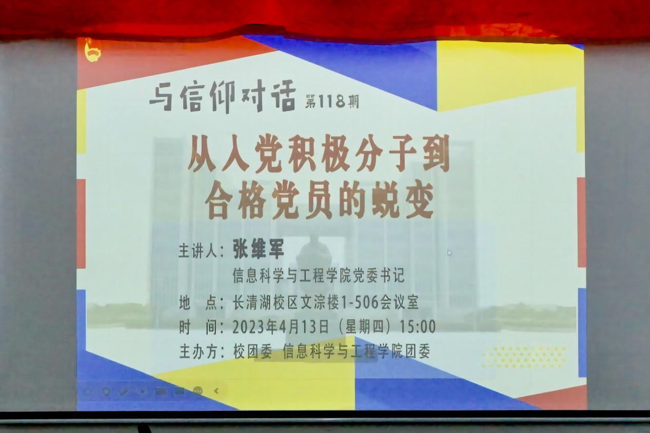 4月13日下午,校团委、信息科学与工程学院团委于长清湖校区文淙楼1-506会议室成功召开与信仰对话之“从入党积极分子到合格党员的蜕变”报告会。本次报告会邀请学院党委书记张维军主讲,研究生辅导员周惠芬主持,学院第66期入党积极分子培训班学员到场聆听。