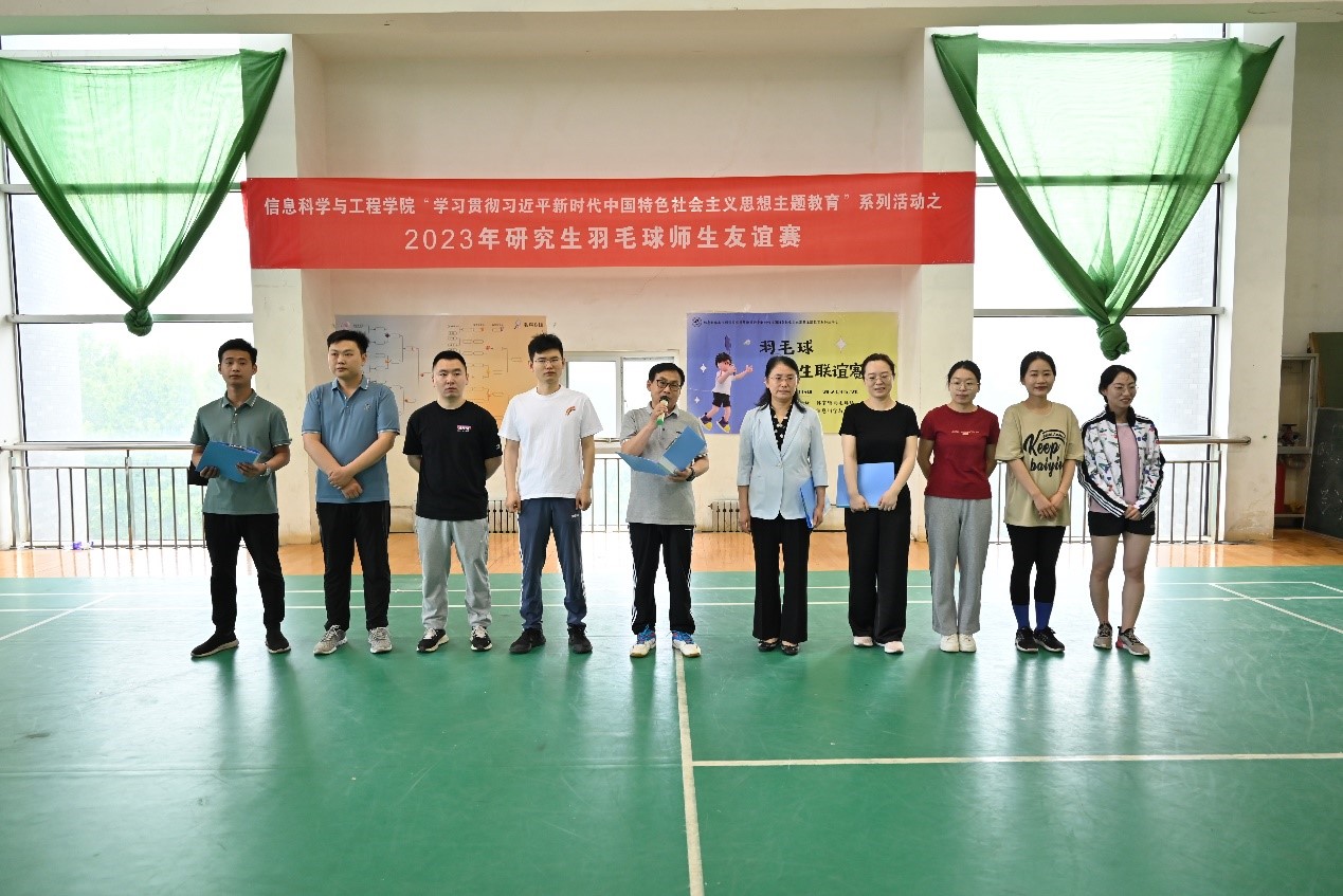 为深入落实“学习贯彻习近平新时代中国特色社会主义思想主题教育”精神,深刻把握习近平总书记关于加快教育强国、体育强国建设的重要指示精神,5月20日上午8:30,由信息科学与工程学院举办的“学习贯彻习近平新时代中国特色社会主义思想主题教育”系列活动之2023年研究生羽毛球师生友谊赛于长清湖校区体育馆二楼羽毛球场地拉开帷幕。开幕式由学院研究生辅导员张亮主持,学院党委书记张维军,党委副书记孙芙蓉,副教授戚萌,专业课教师黄珂、李承浩,办公室韩海琦,研究生辅导员周惠芬,本科生辅导员苗蓝亓、张乾出席。