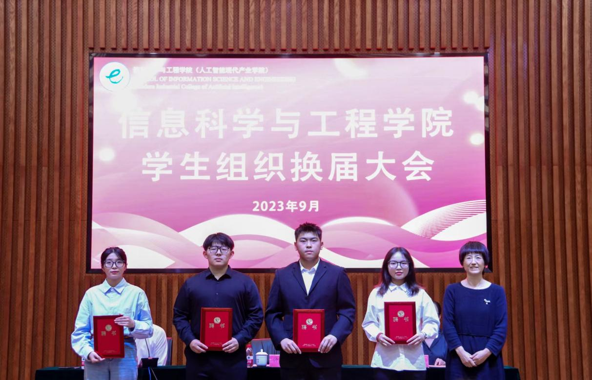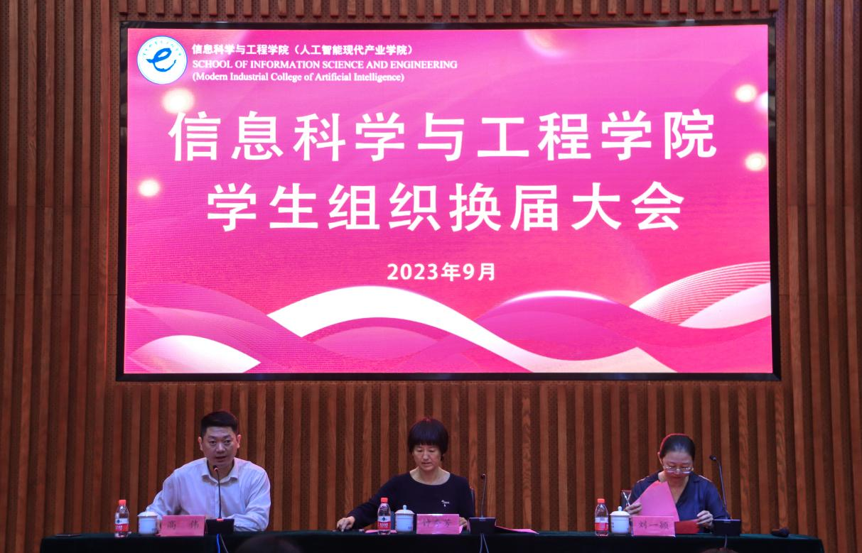 9月21日下午,信息科学与工程学院于长清湖校区文昌楼107多功能会议室召开学生组织换届大会。学院党委书记钟秀芳,党委副书记、纪委书记刘一颍,学工办主任、团委书记高伟以及学院全体辅导员老师出席会议。学院学生会、研究生会、青年志愿者协会、青年媒体中心上届学生组织主席团(理事会)代表,新一届学生组织主席团(理事会)、部长、副部长参加会议。本次会议由高伟主持。