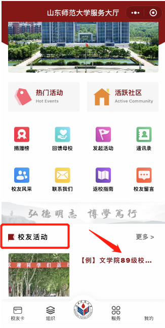 四、对外合作发展办公室(校友工作办公室)通过“山东师范大学校友会”微信公众号推送发布值年返校活动。同时,在公众号“服务大厅”首页发布活动报名信息。