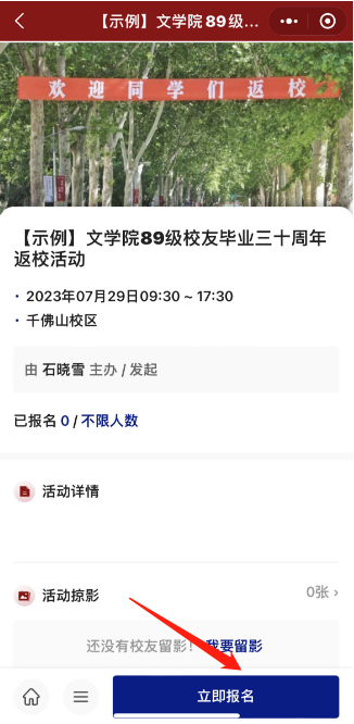 五、参加值年返校的校友,可以通过校友会微信公众号,点击相应的校友活动报名参加。校友办将报名信息表导出后反馈给学院。
