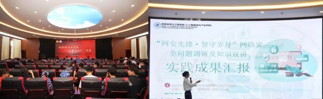 在答辩现场,团队负责人王孝佳以习近平总书记的“没有网络安全就没有国家安全,没有信息化就没有现代化。”这一网络强国建设号召为切入点进行实践成果汇报。“e起护航”社会实践服务队依托于“网安先锋”校级团支部品牌建设项目,由2名预备党员和12名共青团员组队,共同开展了为期40余天的网络安全主题的调研与宣讲活动。