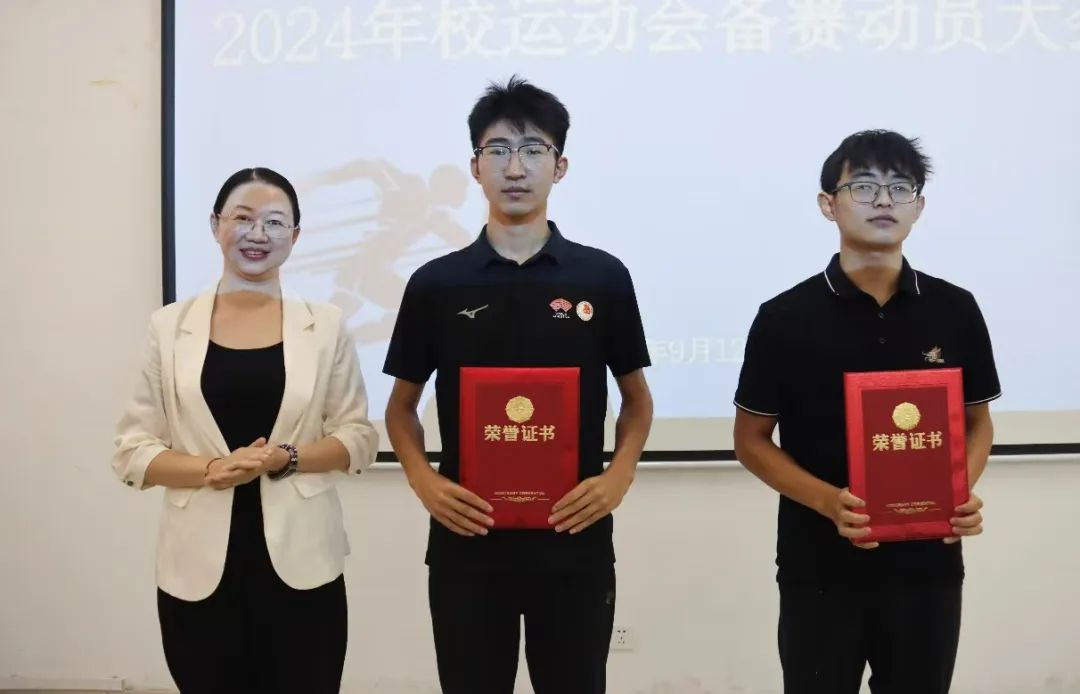 会议中,刘一颍为教练员郭正茂、马树新、葛春熠颁发聘书。学生会执行主席王朝阳对运动会前期筹备情况做了汇报。主教练郭正茂围绕训练目标、训练周期、训练内容等方面宣读了训练计划。学生会体育部部长王威威宣读了运动员训练纪律要求。